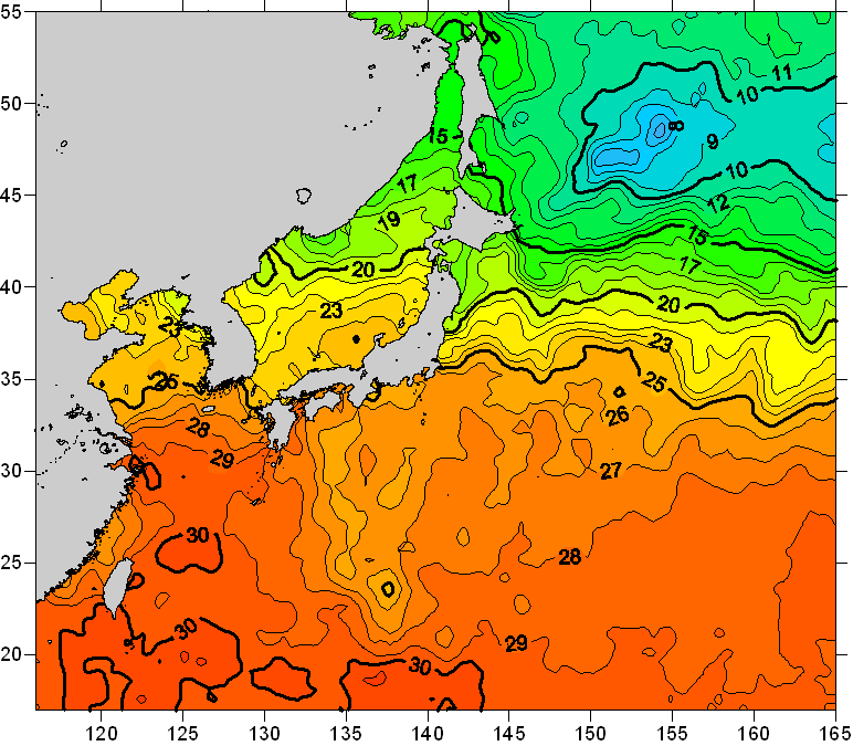 o 2011년 07월 23일 북서태평양 광역해양 수온분포 입니다. o 아래 위성 수온분포도는 국립수산과학원(NFRDI, Korea)과 일본동북대학교 (Tohoku University, Japan)가 공동연구개발 진행중, 1차 연구결과인 것으로 구름의 영향을 배제한 신기술의 수온정보입니다.