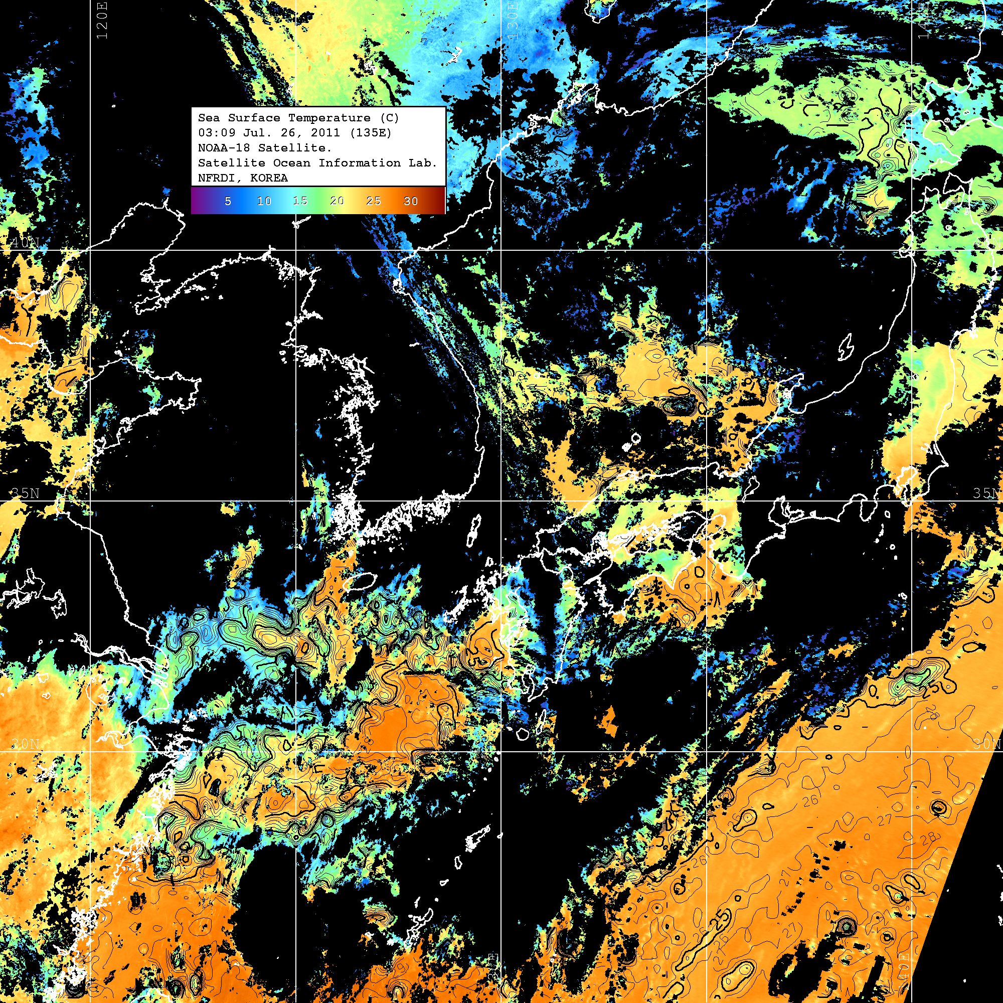 o 2011년 07월 26일 03시 09분 NOAA-18호 위성영상입니다. o 수온분포는 범례를 참고하시기 바랍니다. o 검은색은 구름을 나타냅니다. o 그림을 클릭하시면 크게 보실 수 있습니다.