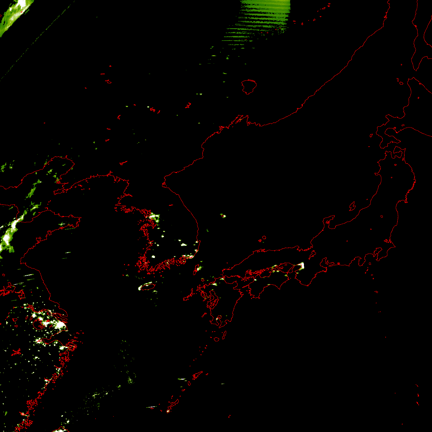 o 2011년 07월 25일 20시 46분 DMSP/OLS(Detense Meteorological Satellite Program/Operating Linescan System) 영상입니다. o DMSP/OLS는 야간 불빛을 탐지하는 위성으로, 야간 조업 어선 분포 현황을 알 수 있습니다. o 그림을 클릭하시면 크게 보실 수 있습니다.