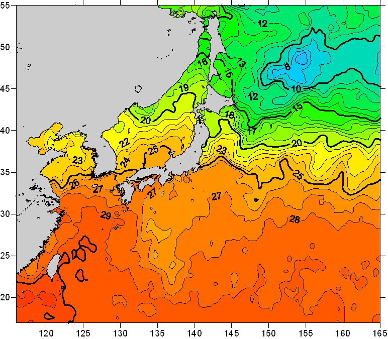 o 2011년 07월 25일 북서태평양 광역해양 수온분포 입니다. o 아래 위성 수온분포도는 국립수산과학원(NFRDI, Korea)과 일본동북대학교 (Tohoku University, Japan)가 공동연구개발 진행중, 1차 연구결과인 것으로 구름의 영향을 배제한 신기술의 수온정보입니다.