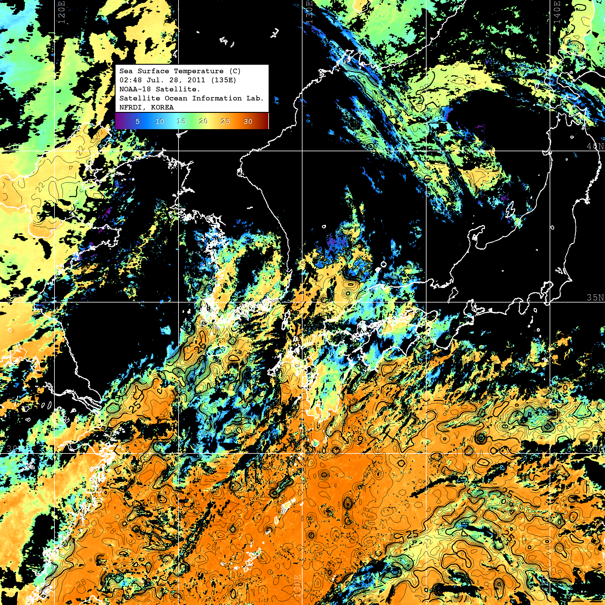 o 2011년 07월 28일 02시 48분 NOAA-18호 위성영상입니다. o 수온분포는 범례를 참고하시기 바랍니다. o 검은색은 구름을 나타냅니다. o 그림을 클릭하시면 크게 보실 수 있습니다.