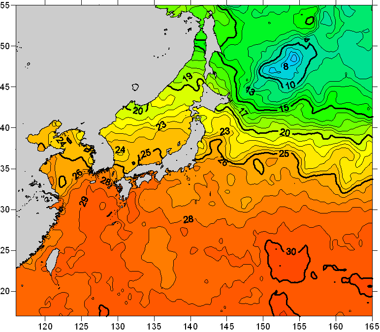 o 2011년 07월 29일 북서태평양 광역해양 수온분포 입니다. o 아래 위성 수온분포도는 국립수산과학원(NFRDI, Korea)과 일본동북대학교 (Tohoku University, Japan)가 공동연구개발 진행중, 1차 연구결과인 것으로 구름의 영향을 배제한 신기술의 수온정보입니다.