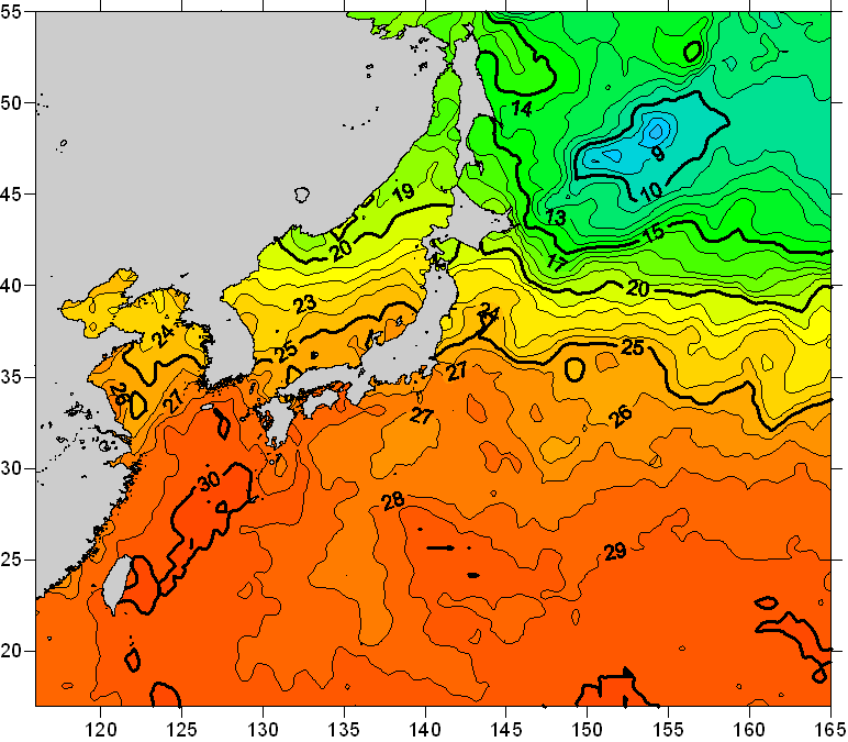 o 2011년 07월 30일 북서태평양 광역해양 수온분포 입니다. o 아래 위성 수온분포도는 국립수산과학원(NFRDI, Korea)과 일본동북대학교 (Tohoku University, Japan)가 공동연구개발 진행중, 1차 연구결과인 것으로 구름의 영향을 배제한 신기술의 수온정보입니다.