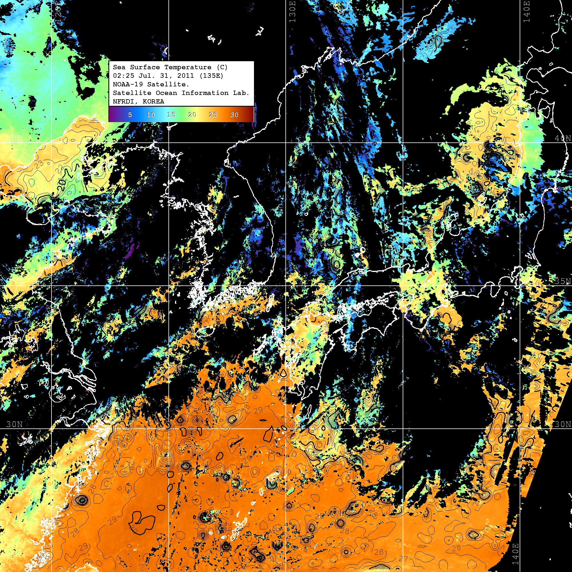 o 2011년 07월 31일 02시 25분 NOAA-19호 위성영상입니다. o 수온분포는 범례를 참고하시기 바랍니다. o 검은색은 구름을 나타냅니다. o 그림을 클릭하시면 크게 보실 수 있습니다.