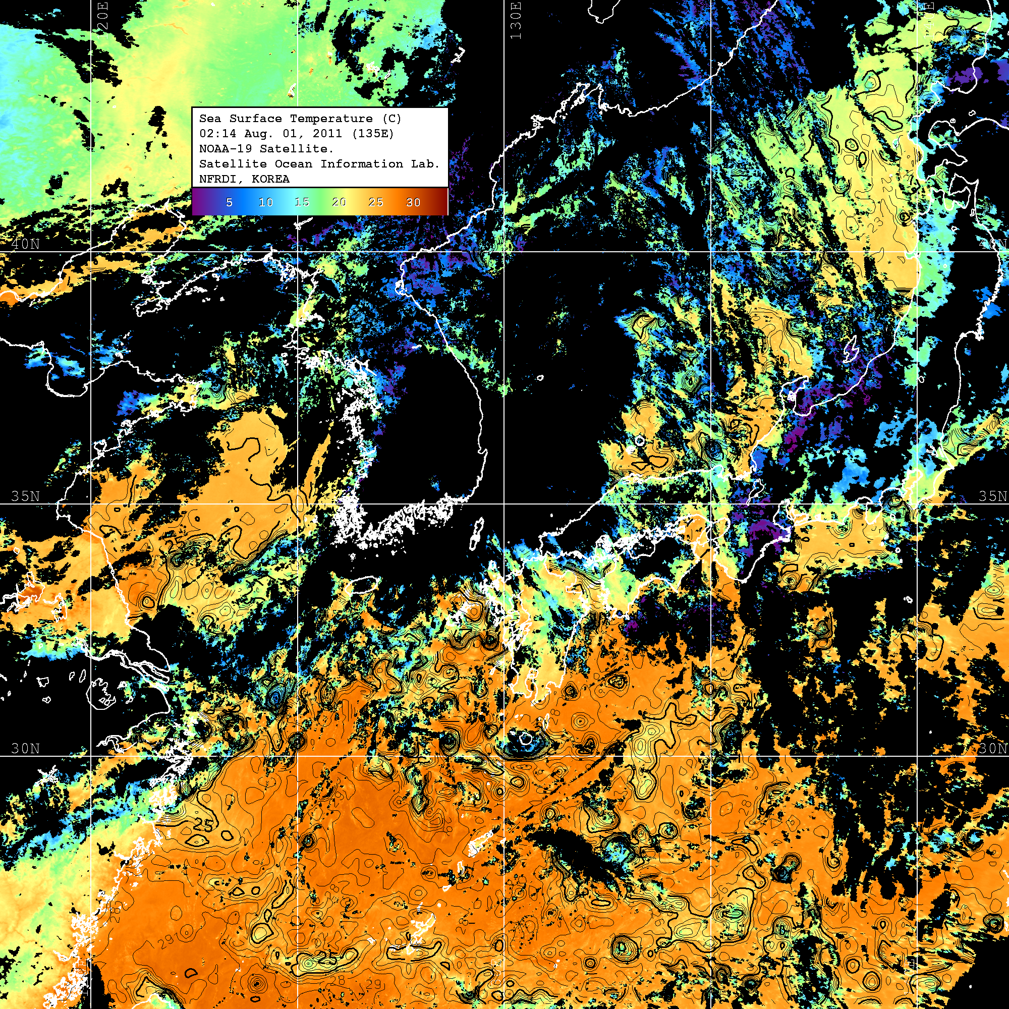 o 2011년 08월 01일 02시 14분 NOAA-19호 위성영상입니다. o 수온분포는 범례를 참고하시기 바랍니다. o 검은색은 구름을 나타냅니다. o 그림을 클릭하시면 크게 보실 수 있습니다.