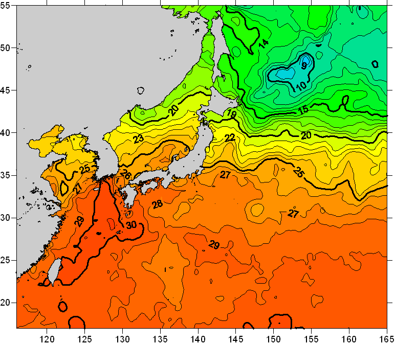 o 2011년 07월 31일 북서태평양 광역해양 수온분포 입니다. o 아래 위성 수온분포도는 국립수산과학원(NFRDI, Korea)과 일본동북대학교 (Tohoku University, Japan)가 공동연구개발 진행중, 1차 연구결과인 것으로 구름의 영향을 배제한 신기술의 수온정보입니다.
