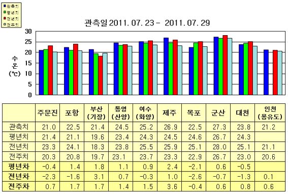o 금주(2011.07.23~2011.07.29)의 한반도 연안 표면수온은 동해 연안역에서 섭씨 21.0~22.5도, 남해 연안역 24.5~27.0도, 서해 연안역에서 21.0~27.5도로 나타납니다. o 평년에 비해 주문진 0.4도 낮음을 제외한 동해 연안역은 1~2도 높게, 남해 연안역은 1.5~2.5도 높게, 군산 0.6도 높음을 제외한 서해 연안역은 0.5~2.0도 낮게 나타납니다. o 전년에 비해 부산(기장) 3.1도 높음을 제외한 동해 연안역은 1.5~2.5도 낮게, 여수(화양) 0.3도 낮음을 제외한 남해 연안역은 0.5~1.0도 높게, 인천(용유도) 비슷함을 제외한 서해 연안역은 0.5~2.5도 낮게 나타납니다.