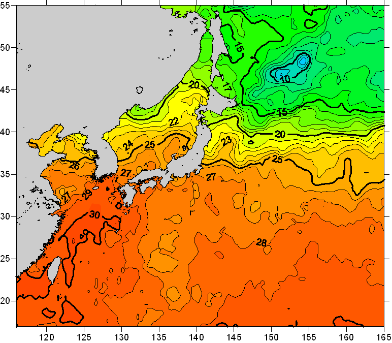 o 2011년 08월 02일 북서태평양 광역해양 수온분포 입니다. o 아래 위성 수온분포도는 국립수산과학원(NFRDI, Korea)과 일본동북대학교 (Tohoku University, Japan)가 공동연구개발 진행중, 1차 연구결과인 것으로 구름의 영향을 배제한 신기술의 수온정보입니다.