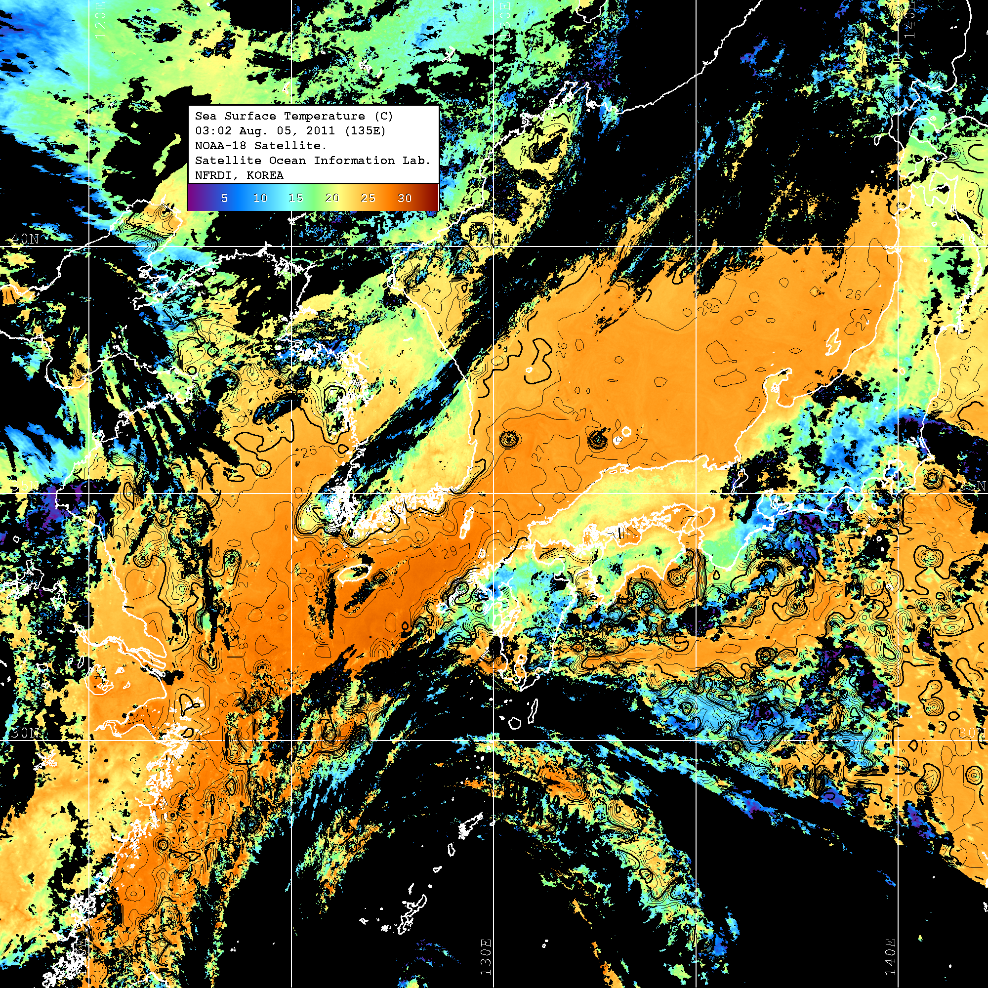 o 2011년 08월 05일 03시 02분 NOAA-18호 위성영상입니다. o 수온분포는 범례를 참고하시기 바랍니다. o 검은색은 구름을 나타냅니다. o 그림을 클릭하시면 크게 보실 수 있습니다.