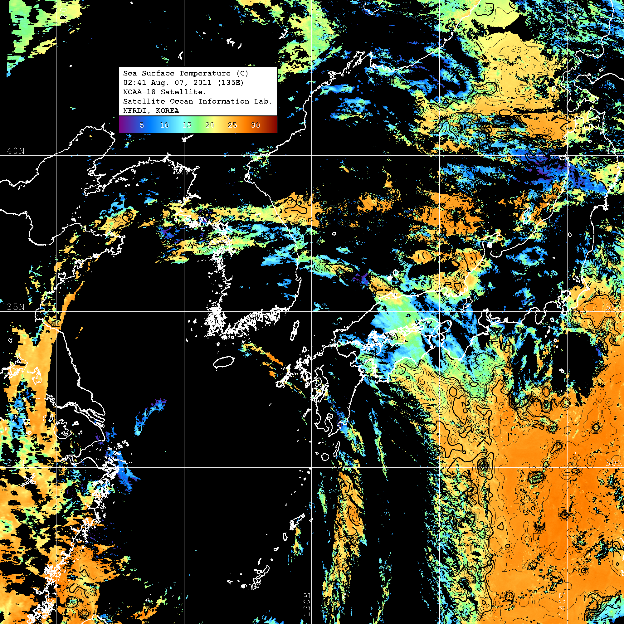 o 2011년 08월 07일 02시 41분 NOAA-18호 위성영상입니다. o 수온분포는 범례를 참고하시기 바랍니다. o 검은색은 구름을 나타냅니다. o 그림을 클릭하시면 크게 보실 수 있습니다.