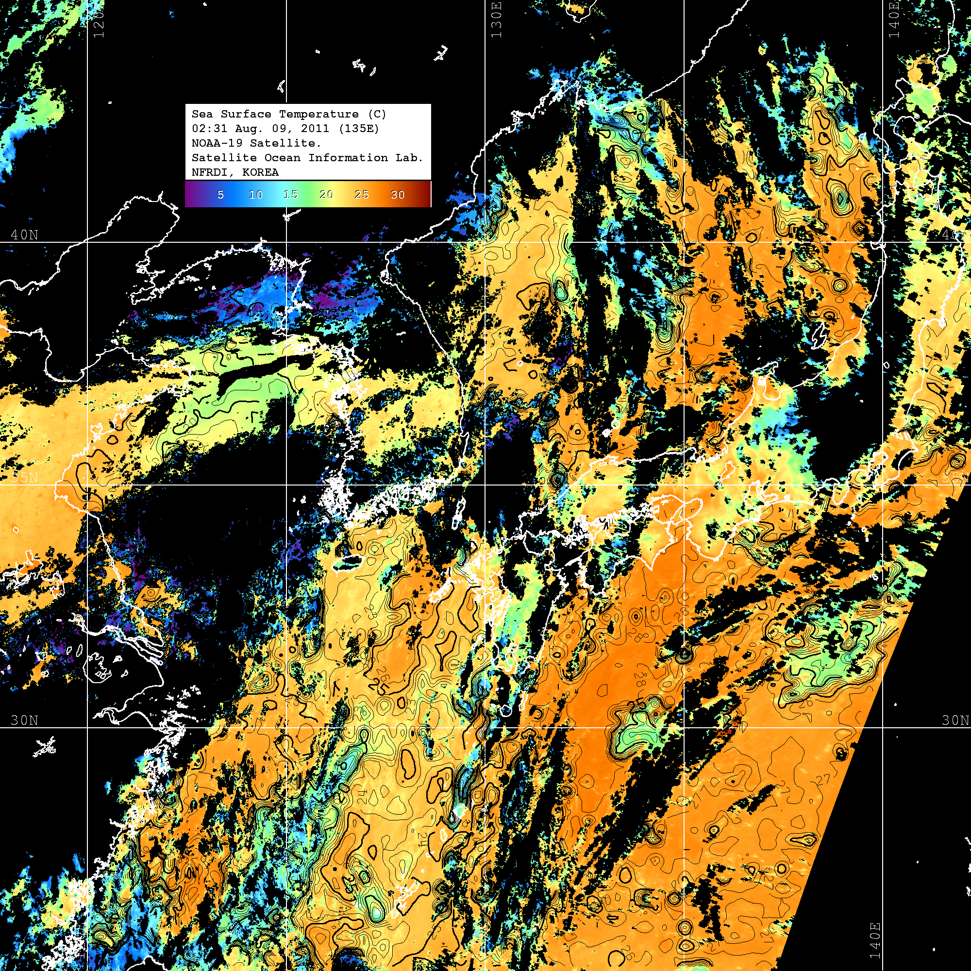 o 2011년 08월 09일 02시 31분 NOAA-19호 위성영상입니다. o 수온분포는 범례를 참고하시기 바랍니다. o 검은색은 구름을 나타냅니다. o 그림을 클릭하시면 크게 보실 수 있습니다.