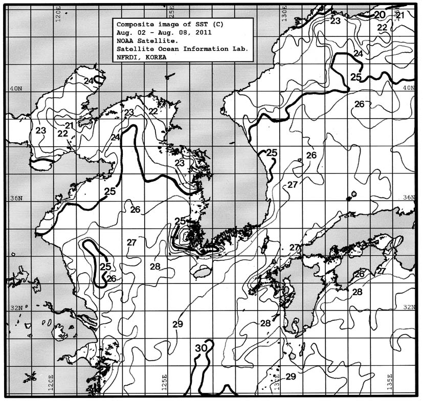 o 금주(2011.08.02~2011.08.08)의 한국근해 표면수온은 대화퇴 근해 25~26도, 울릉도 근해 26~27도, 대마도 근해 28~29도, 제주도 근해 28~29도, 이어도 근해 28~29도, 가거초 근해 27~28도, 어청도 근해 25~26도로 나타납니다. o「평년에 비해」대화퇴 근해 0.4도 높게, 울릉도 근해 0.5도 높게, 대마도 근해 0.9도 높게, 제주도 근해 0.7도 높게, 이어도 근해 비슷하게, 가거초 근해 0.9도 높게, 어청도 근해는 0.3도 낮게 나타납니다. o「전년에 비해」대화퇴 근해 1도 낮게, 울릉도 근해 1.5도 낮게, 대마도 근해 0.5도 낮게, 제주도 근해 0.5도 낮게, 이어도 근해 비슷하게, 가거초 근해 0.5도 낮게, 어청도 근해는 2.5도 낮게 나타납니다. o 수온 전선대는 우리나라 제주해협에서 대한해협까지 27도를 중심으로 형성됩니다.