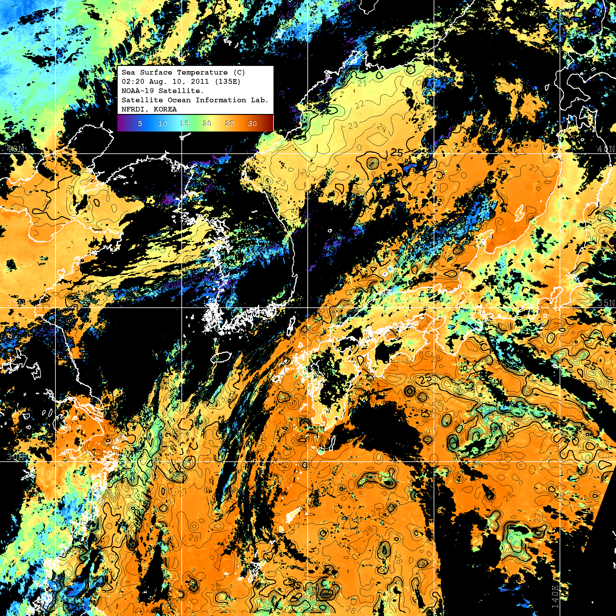 o 2011년 08월 10일 02시 20분 NOAA-19호 위성영상입니다. o 수온분포는 범례를 참고하시기 바랍니다. o 검은색은 구름을 나타냅니다. o 그림을 클릭하시면 크게 보실 수 있습니다.