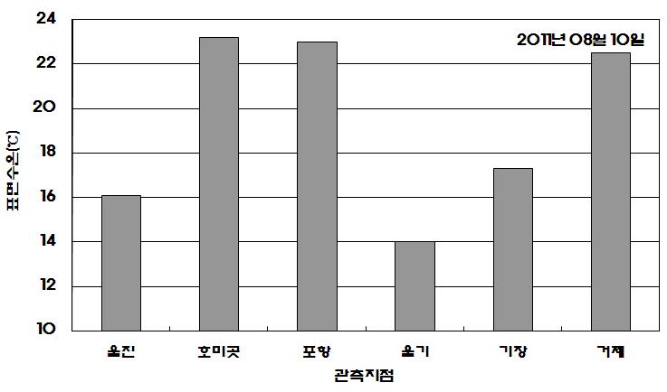 o 2011년 08월 10일 오후 2시를 기해 울진, 울기 및 부산(기장) 연안 냉수대 주의보를 발령합니다. o 아래 그림은 2011년 08월 10일 오전 10시에 관측된 현장 표면수온 분포입니다. o 오전 10시 현재 연안 관측 표면수온은 울진 16.1도, 호미곳 23.2도, 포항 23도, 울기 14도, 부산(기장)은 17.3도, 거제 22.5도로 나타납니다. o 냉수대가 발생한 해역은 수온변동과 짙은 안개가 나타나고 있어 이 일대 어업인, 해수욕장, 선박 운항자께서는 각별한 주의를 바랍니다.