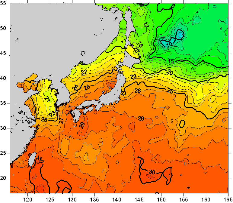 o 2011년 08월 10일 북서태평양 광역해양 수온분포 입니다. o 아래 위성 수온분포도는 국립수산과학원(NFRDI, Korea)과 일본동북대학교 (Tohoku University, Japan)가 공동연구개발 진행중, 1차 연구결과인 것으로 구름의 영향을 배제한 신기술의 수온정보입니다.