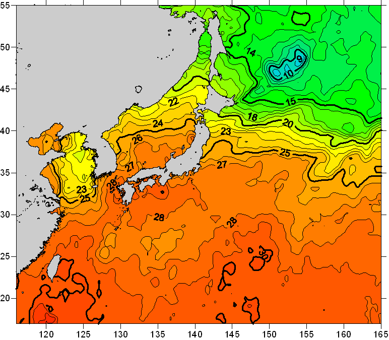 o 2011년 08월 12일 북서태평양 광역해양 수온분포 입니다. o 아래 위성 수온분포도는 국립수산과학원(NFRDI, Korea)과 일본동북대학교 (Tohoku University, Japan)가 공동연구개발 진행중, 1차 연구결과인 것으로 구름의 영향을 배제한 신기술의 수온정보입니다.