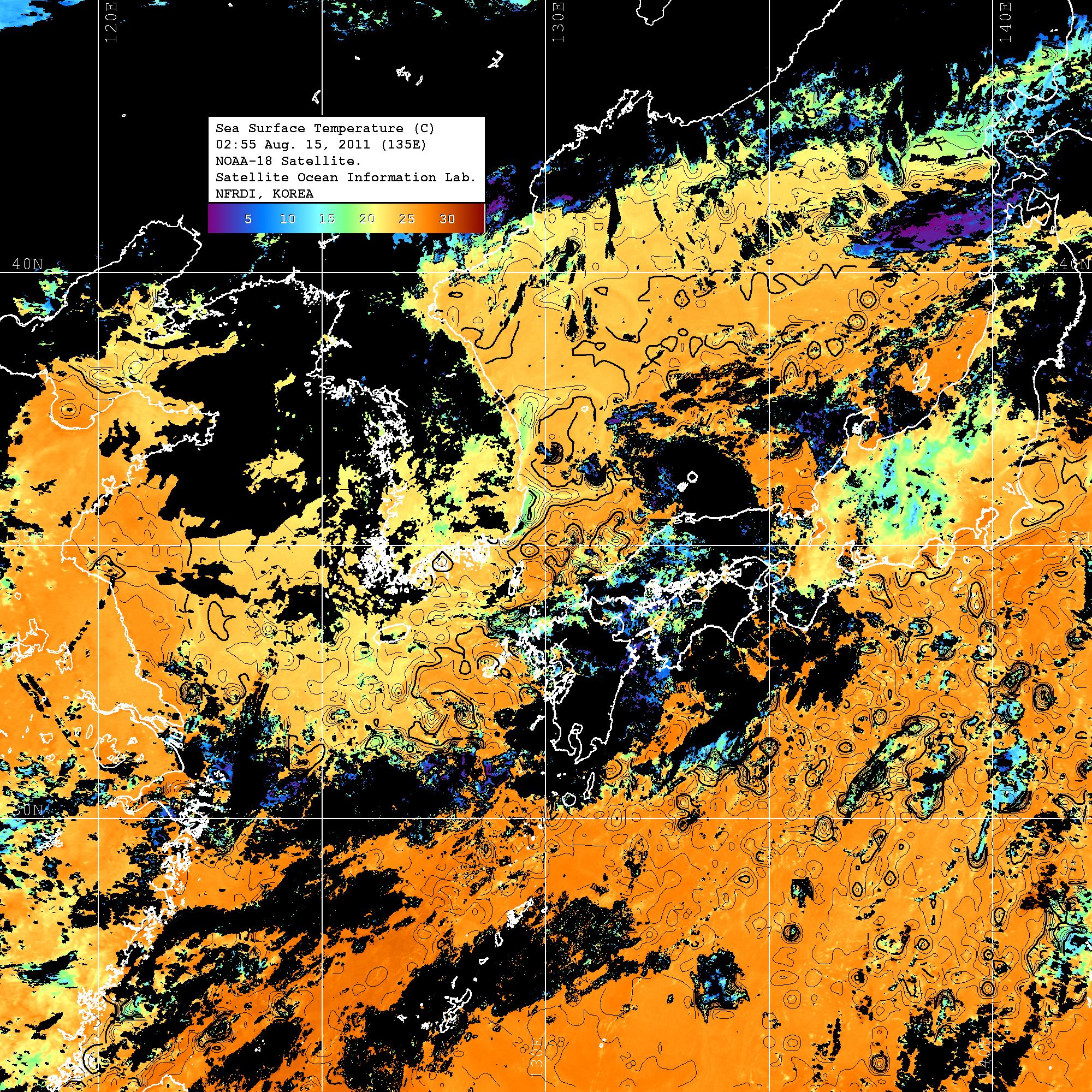 o 2011년 08월 15일 02시 55분 NOAA-18호 위성영상입니다. o 수온분포는 범례를 참고하시기 바랍니다. o 검은색은 구름을 나타냅니다. o 그림을 클릭하시면 크게 보실 수 있습니다.