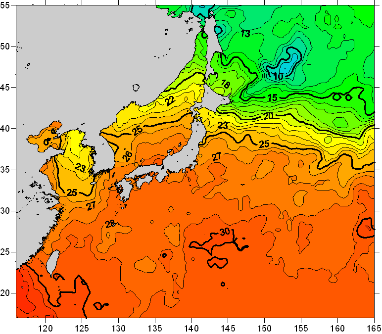 o 2011년 08월 15일 북서태평양 광역해양 수온분포 입니다. o 아래 위성 수온분포도는 국립수산과학원(NFRDI, Korea)과 일본동북대학교 (Tohoku University, Japan)가 공동연구개발 진행중, 1차 연구결과인 것으로 구름의 영향을 배제한 신기술의 수온정보입니다.