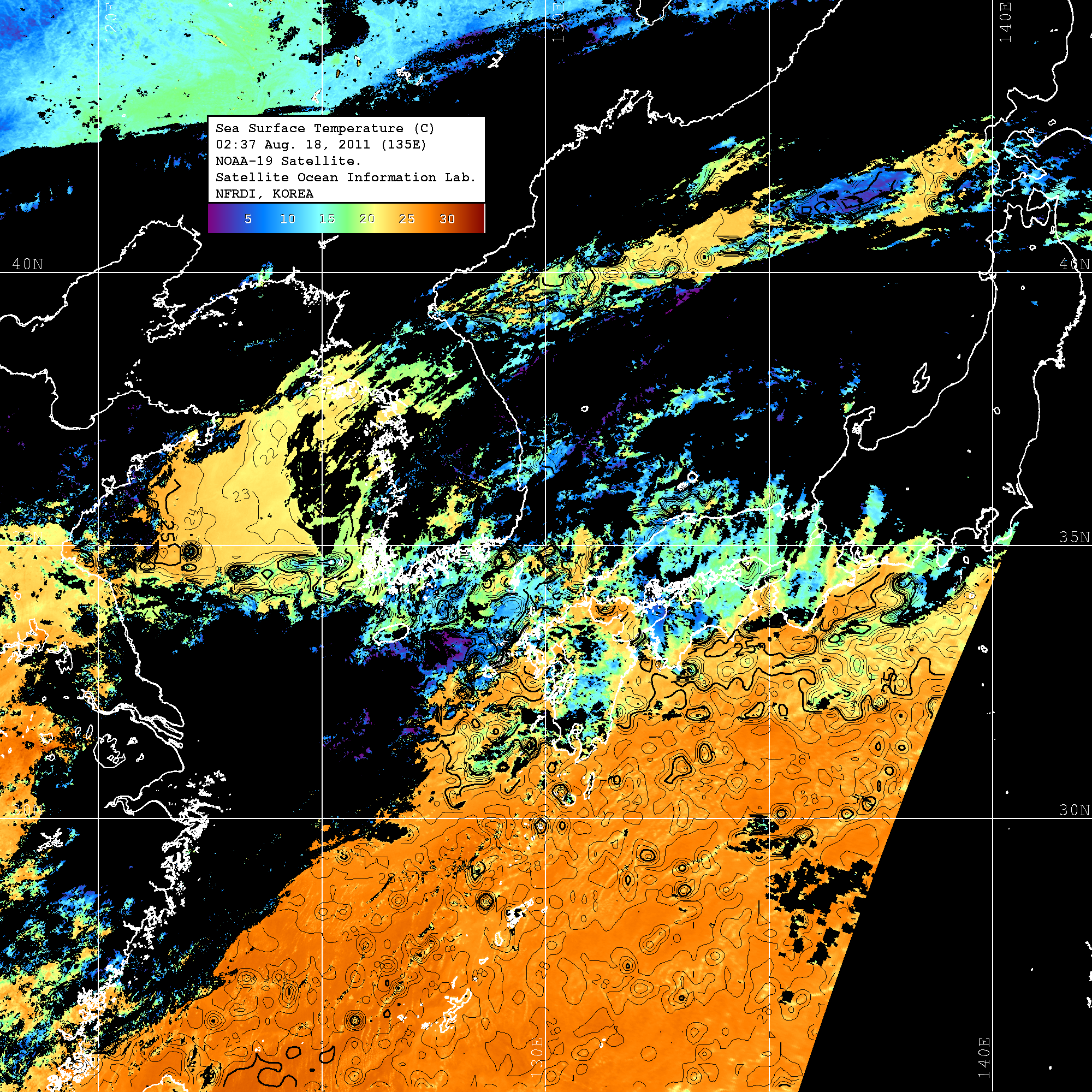 o 2011년 08월 18일 02시 37분 NOAA-19호 위성영상입니다. o 수온분포는 범례를 참고하시기 바랍니다. o 검은색은 구름을 나타냅니다. o 그림을 클릭하시면 크게 보실 수 있습니다.