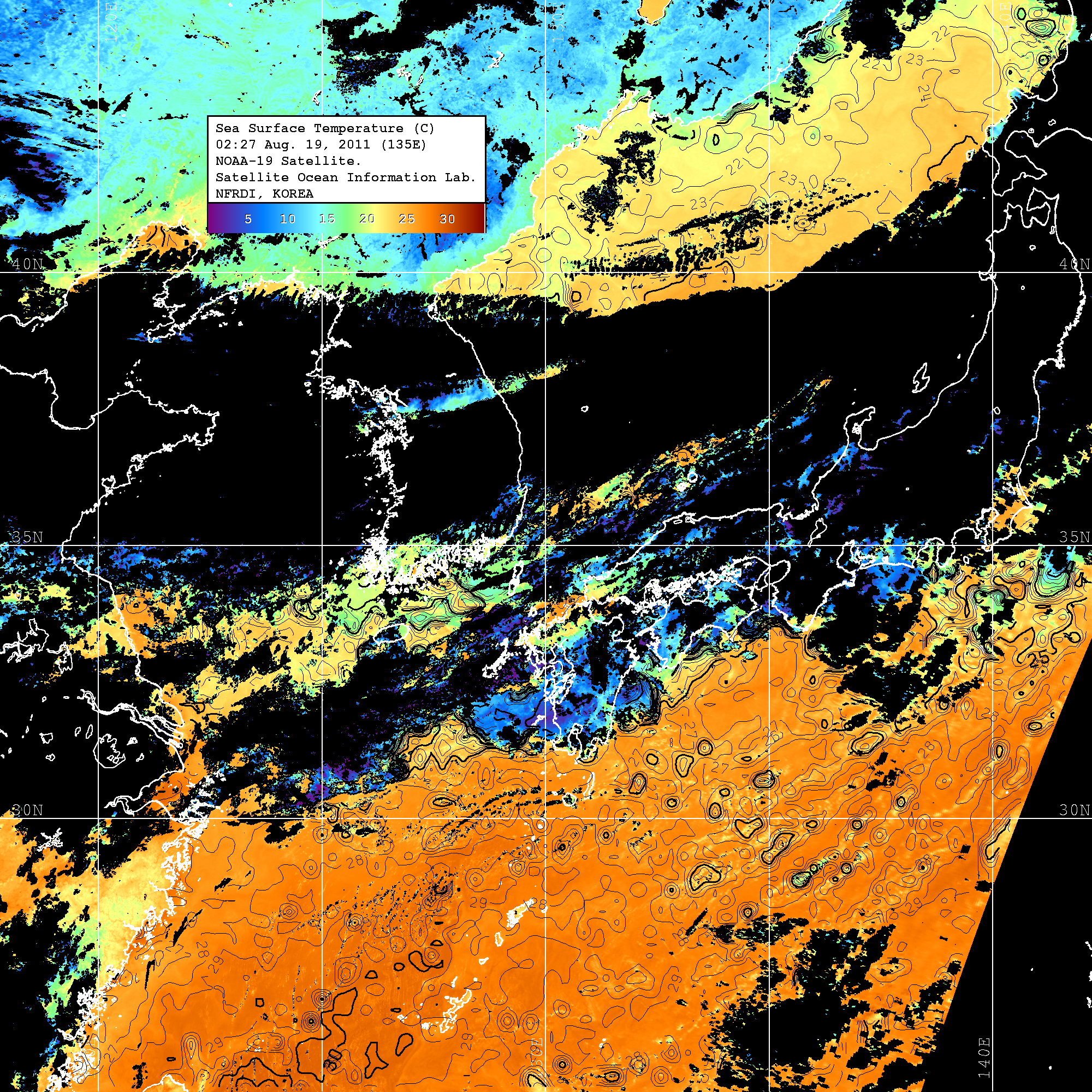 o 2011년 08월 19일 02시 27분 NOAA-19호 위성영상입니다. o 수온분포는 범례를 참고하시기 바랍니다. o 검은색은 구름을 나타냅니다. o 그림을 클릭하시면 크게 보실 수 있습니다.