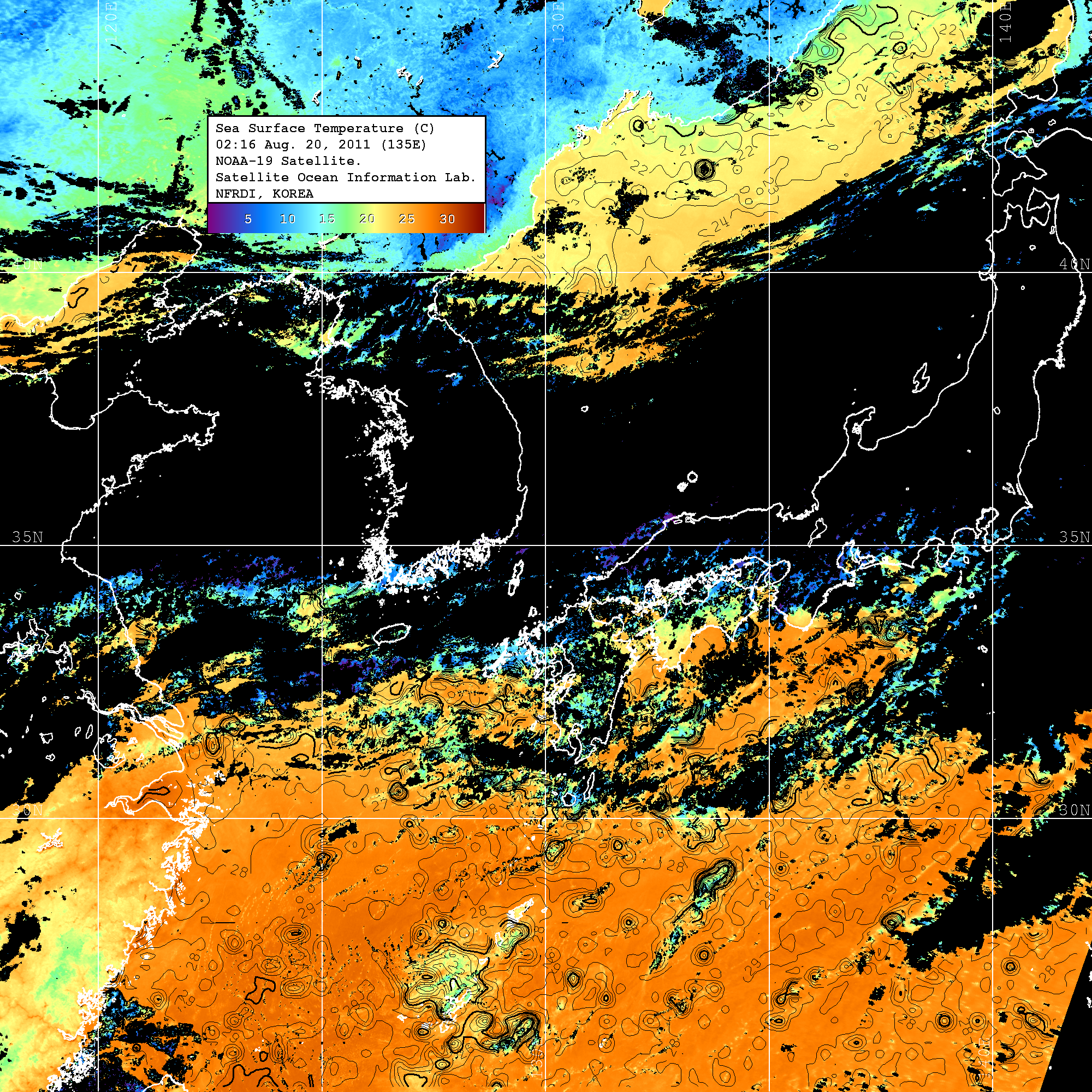 o 2011년 08월 20일 02시 16분 NOAA-19호 위성영상입니다. o 수온분포는 범례를 참고하시기 바랍니다. o 검은색은 구름을 나타냅니다. o 그림을 클릭하시면 크게 보실 수 있습니다.