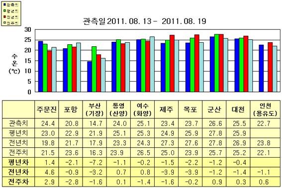 o 금주(2011.08.13~2011.08.19)의 한반도 연안 표면수온은 동해 연안역에서 섭씨 14.5~24.5도, 남해 연안역 23.0~25.5도, 서해 연안역에서 22.5~27.0도로 나타납니다. o 평년에 비해 주문진 1.4도 높음을 제외한 동해 연안역은 2.0~7.5도 낮게, 여수(화양) 비슷함을 제외한 남해 연안역은 1.0~1.5도 낮게, 서해 연안역은 0.5~2.5도 낮게 나타납니다. o 전년에 비해 주문진 4.6도 높음을 제외한 동해 연안역은 0.5~3.5도 낮게, 제주 3.9도 낮음을 제외한 남해 연안역은 0.5~1.0도 높게, 서해 연안역은 1~4도 낮게 나타납니다.