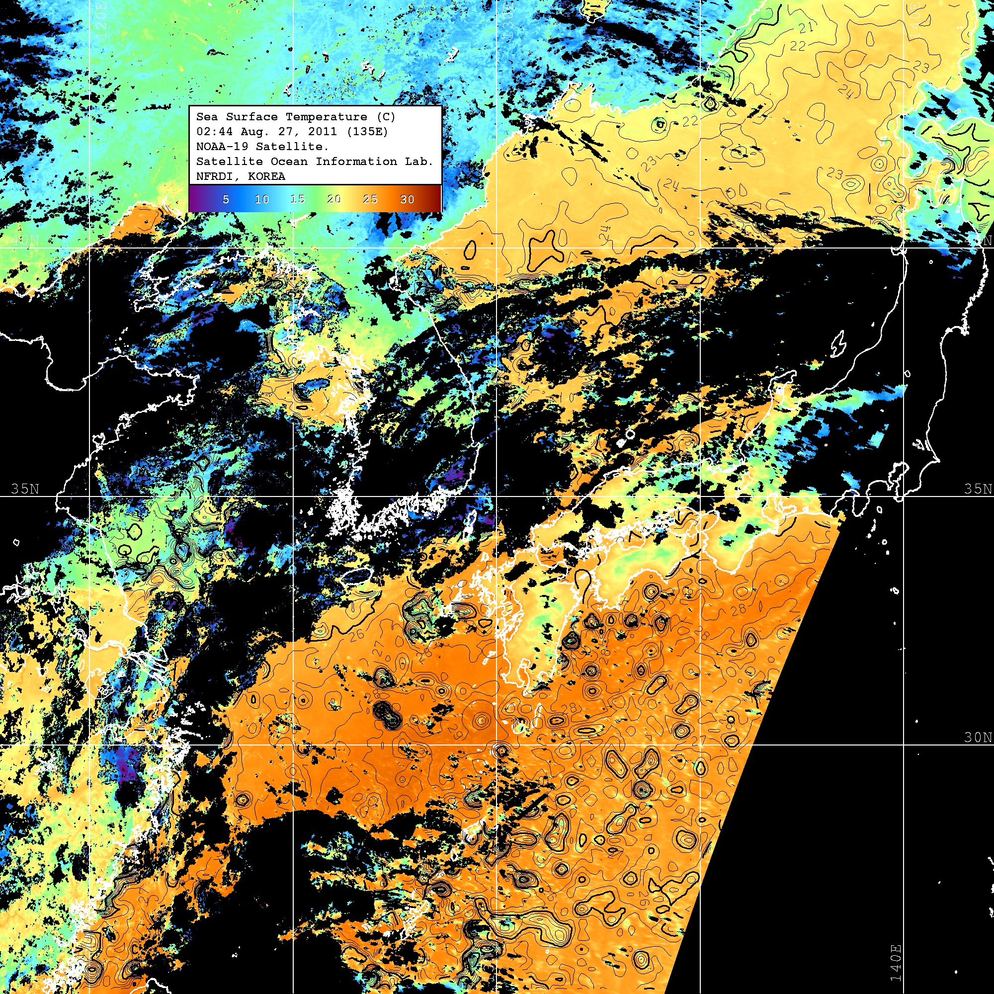 o 2011년 08월 27일 02시 44분 NOAA-19호 위성영상입니다. o 수온분포는 범례를 참고하시기 바랍니다. o 검은색은 구름을 나타냅니다. o 그림을 클릭하시면 크게 보실 수 있습니다.