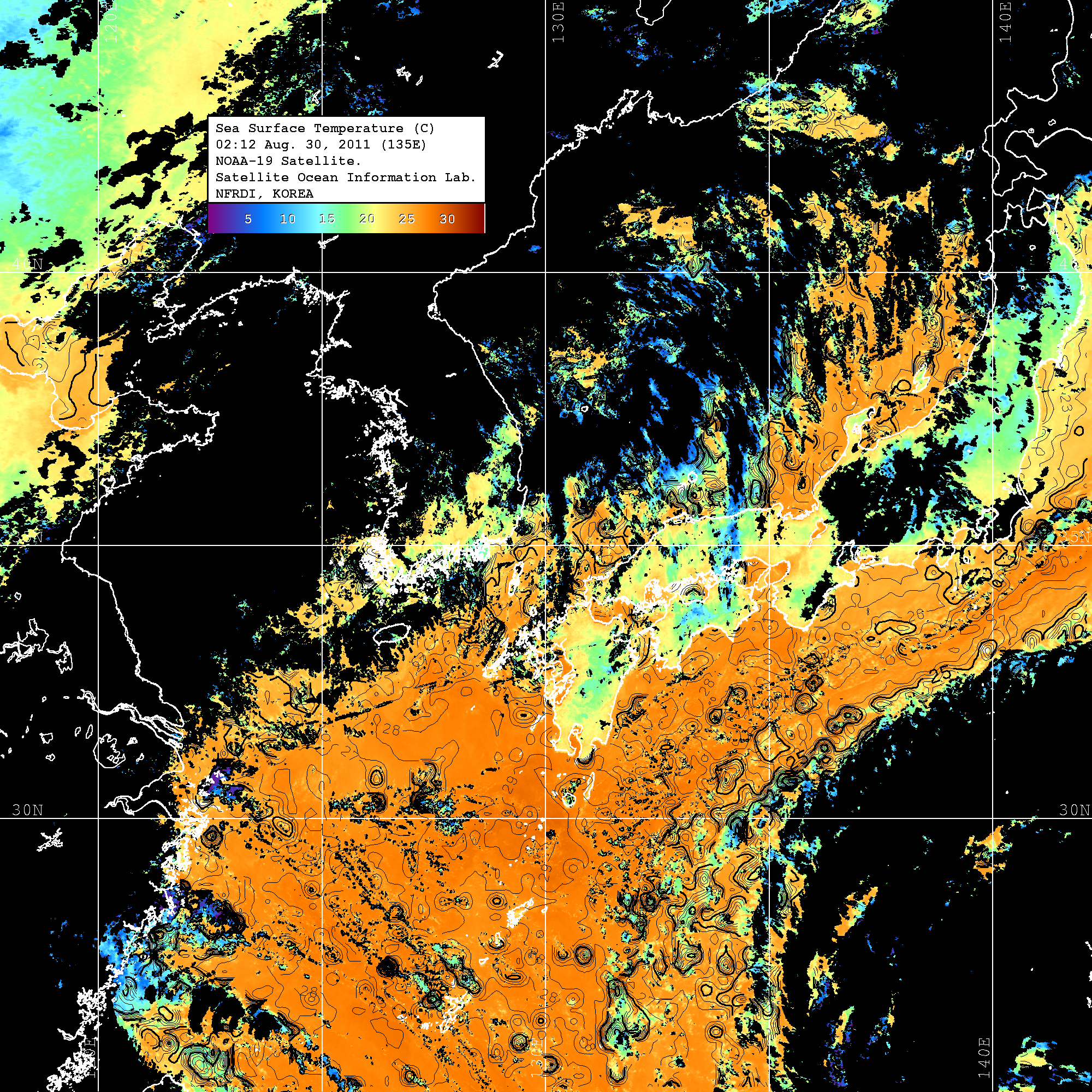 o 2011년 08월 30일 02시 12분 NOAA-19호 위성영상입니다. o 수온분포는 범례를 참고하시기 바랍니다. o 검은색은 구름을 나타냅니다. o 그림을 클릭하시면 크게 보실 수 있습니다.