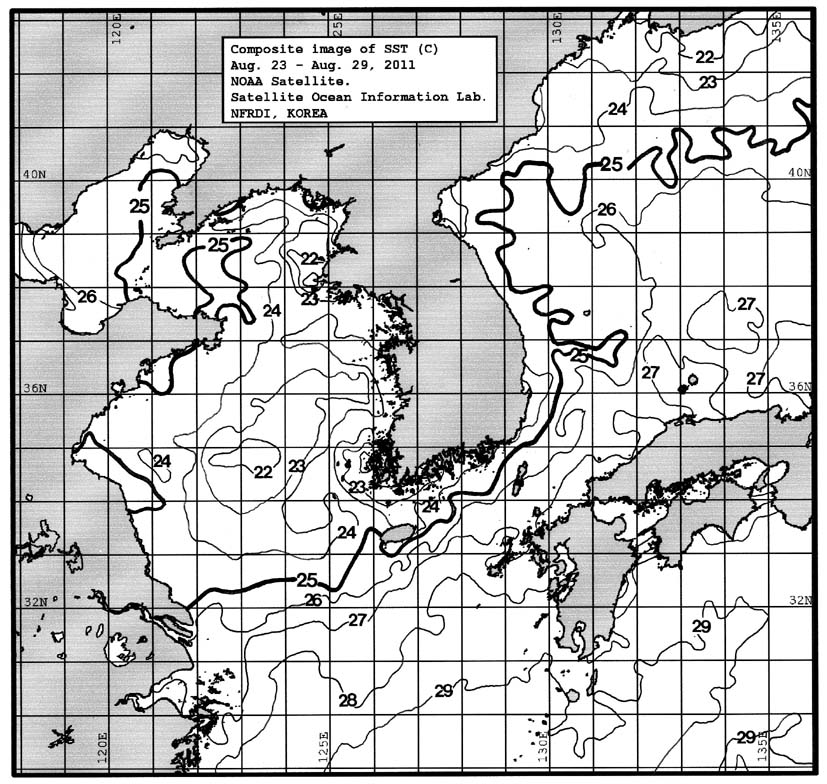o 금주(2011.08.23~2011.08.29)의 한국근해 표면수온은 대화퇴 근해 26~27도, 울릉도 근해 25~26도, 대마도 근해 25~26도, 제주도 근해 24~25도, 이어도 근해 26~27도, 가거초 근해 23~24도, 어청도 근해 23~24도로 나타납니다. o「평년에 비해」대화퇴 근해 2.6도 높게, 울릉도 근해 1.1도 높게, 대마도 근해 0.7도 낮게, 제주도 근해 2.6도 낮게, 이어도 근해 1.1도 낮게, 가거초 근해 1.9도 낮게, 어청도 근해는 1.4도 낮게 나타납니다. o「전년에 비해」대화퇴 근해 0.5도 낮게, 울릉도 근해 1.5도 낮게, 대마도 근해 3도 낮게, 제주도 근해 4.5도 낮게, 이어도 근해 3도 낮게, 가거초 근해 4도 낮게, 어청도 근해는 2.5도 낮게 나타납니다. o 수온 전선대는 우리나라 제주해협에서 대한해협까지 25도를 중심으로 형성됩니다.