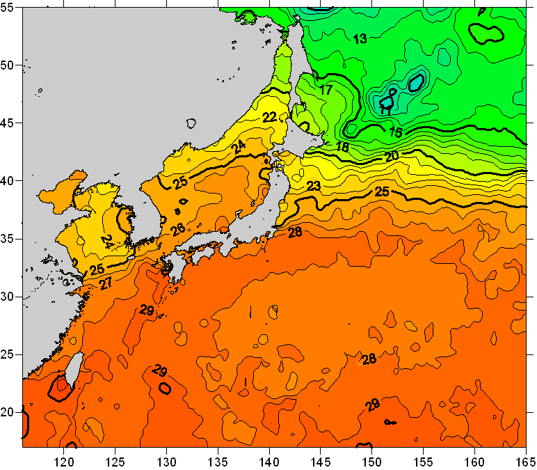 o 2011년 08월 29일 북서태평양 광역해양 수온분포 입니다. o 아래 위성 수온분포도는 국립수산과학원(NFRDI, Korea)과 일본동북대학교 (Tohoku University, Japan)가 공동연구개발 진행중, 1차 연구결과인 것으로 구름의 영향을 배제한 신기술의 수온정보입니다.