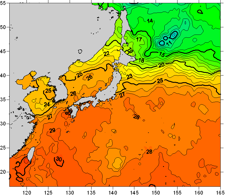 o 2011년 08월 30일 북서태평양 광역해양 수온분포 입니다. o 아래 위성 수온분포도는 국립수산과학원(NFRDI, Korea)과 일본동북대학교 (Tohoku University, Japan)가 공동연구개발 진행중, 1차 연구결과인 것으로 구름의 영향을 배제한 신기술의 수온정보입니다.