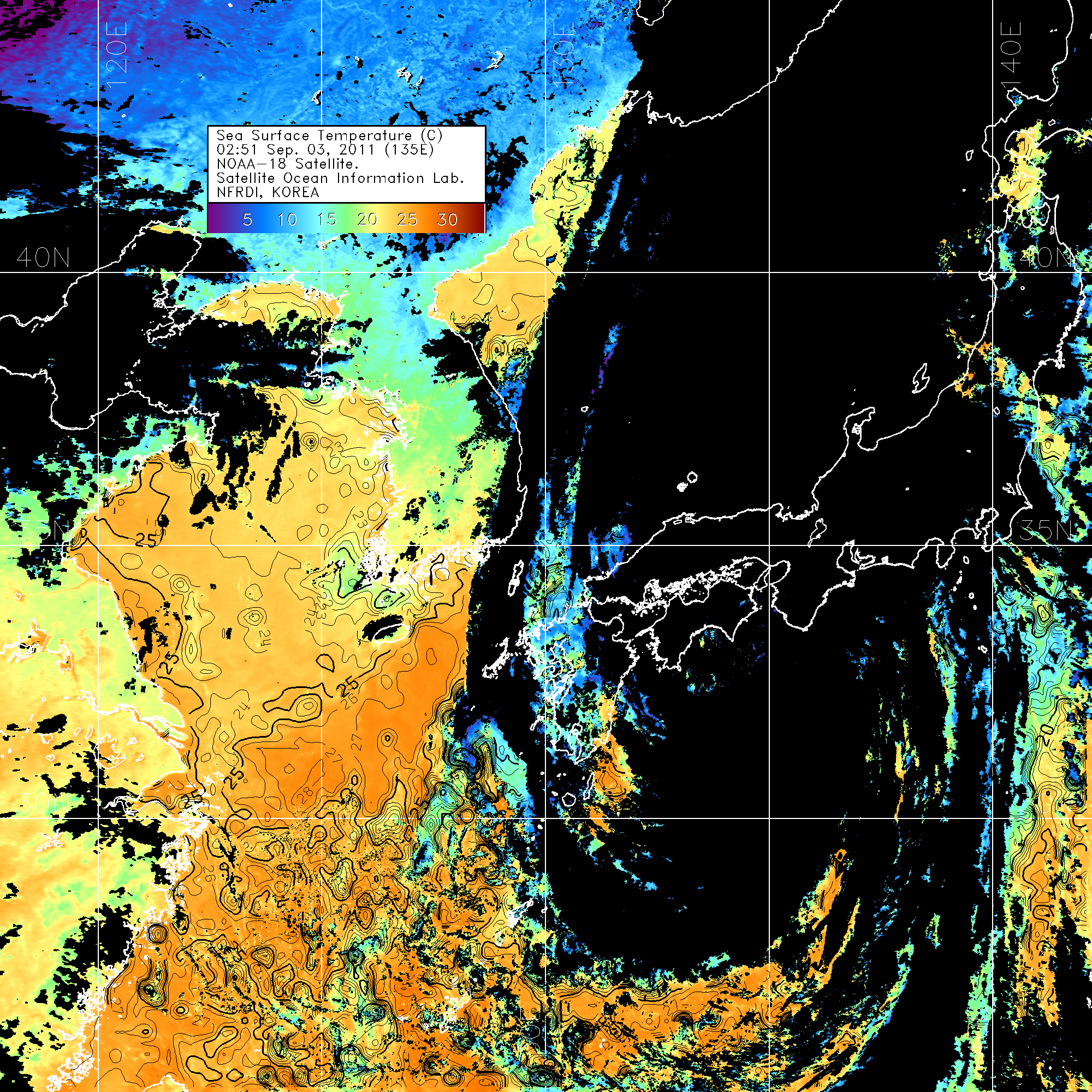 o 2011년 09월 03일 02시 51분 NOAA-18호 위성영상입니다. o 수온분포는 범례를 참고하시기 바랍니다. o 검은색은 구름을 나타냅니다. o 그림을 클릭하시면 크게 보실 수 있습니다.