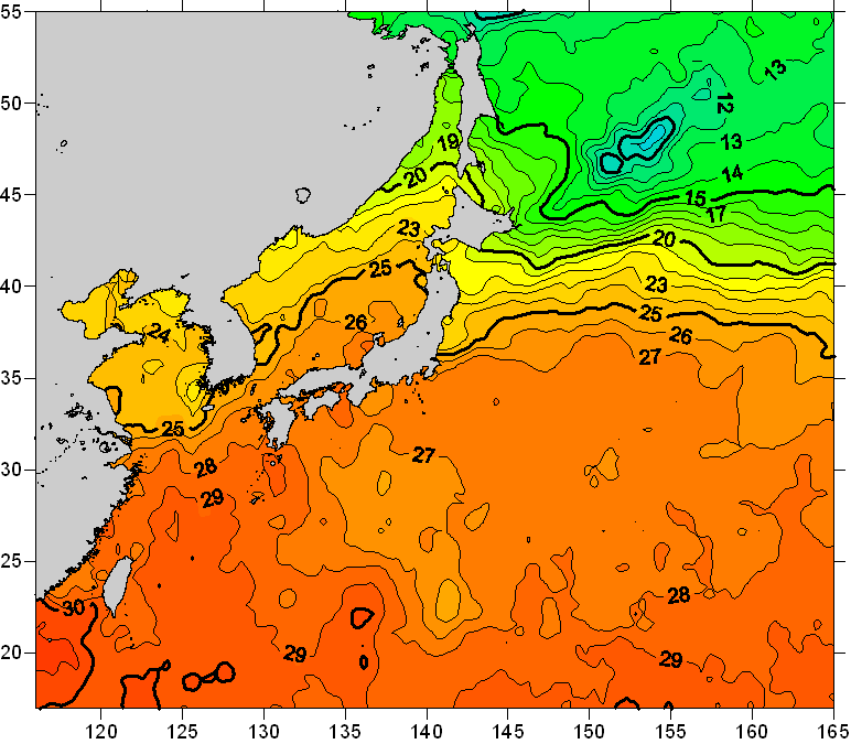o 2011년 09월 03일 북서태평양 광역해양 수온분포 입니다. o 아래 위성 수온분포도는 국립수산과학원(NFRDI, Korea)과 일본동북대학교 (Tohoku University, Japan)가 공동연구개발 진행중, 1차 연구결과인 것으로 구름의 영향을 배제한 신기술의 수온정보입니다.