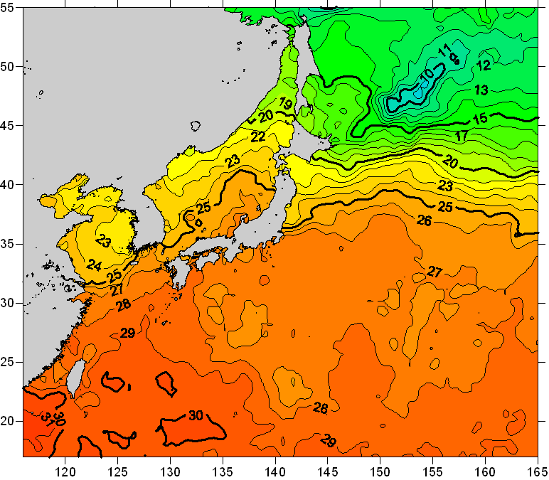 o 2011년 09월 04일 북서태평양 광역해양 수온분포 입니다. o 아래 위성 수온분포도는 국립수산과학원(NFRDI, Korea)과 일본동북대학교 (Tohoku University, Japan)가 공동연구개발 진행중, 1차 연구결과인 것으로 구름의 영향을 배제한 신기술의 수온정보입니다.