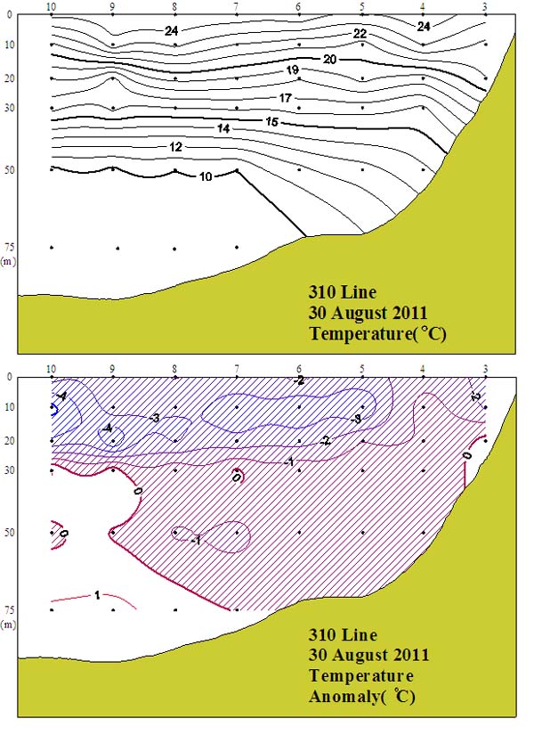 ㅇ 2011년 8월 30일 국립수산과학원 서해수산연구소에서 조사한 310선(영광 서방)의 수직수온분포도 및 평년편차도입니다. ㅇ 19℃를 중심으로 한 수온약층은 10~30m 부근에서 나타났고 정점 7~9의 저층에 냉수가 존재하고 있었습니다. ㅇ 평년에 비하여 대체로 1~3℃의 저온현상을 보였으나, 정점 8~10의 30m 수층 이심에서 1℃ 내외의 고온현상을 보였습니다.