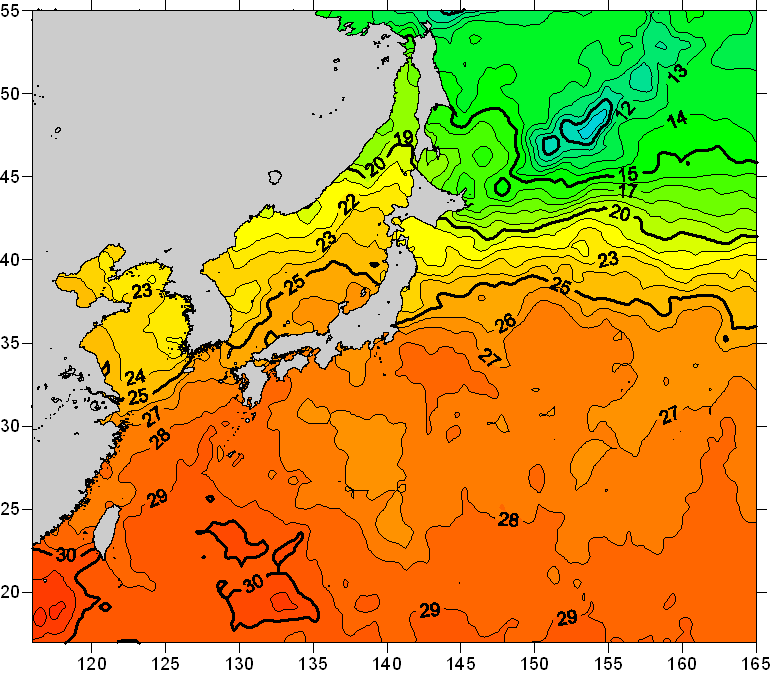 o 2011년 09월 05일 북서태평양 광역해양 수온분포 입니다. o 아래 위성 수온분포도는 국립수산과학원(NFRDI, Korea)과 일본동북대학교 (Tohoku University, Japan)가 공동연구개발 진행중, 1차 연구결과인 것으로 구름의 영향을 배제한 신기술의 수온정보입니다.