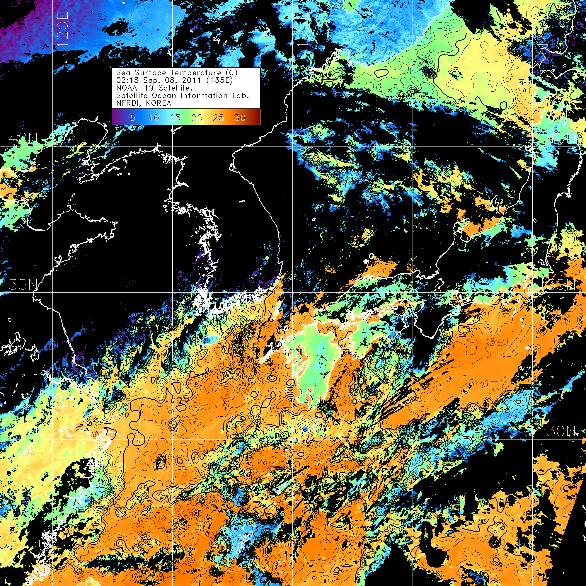 o 2011년 09월 08일 02시 18분 NOAA-19호 위성영상입니다. o 수온분포는 범례를 참고하시기 바랍니다. o 검은색은 구름을 나타냅니다. o 그림을 클릭하시면 크게 보실 수 있습니다.