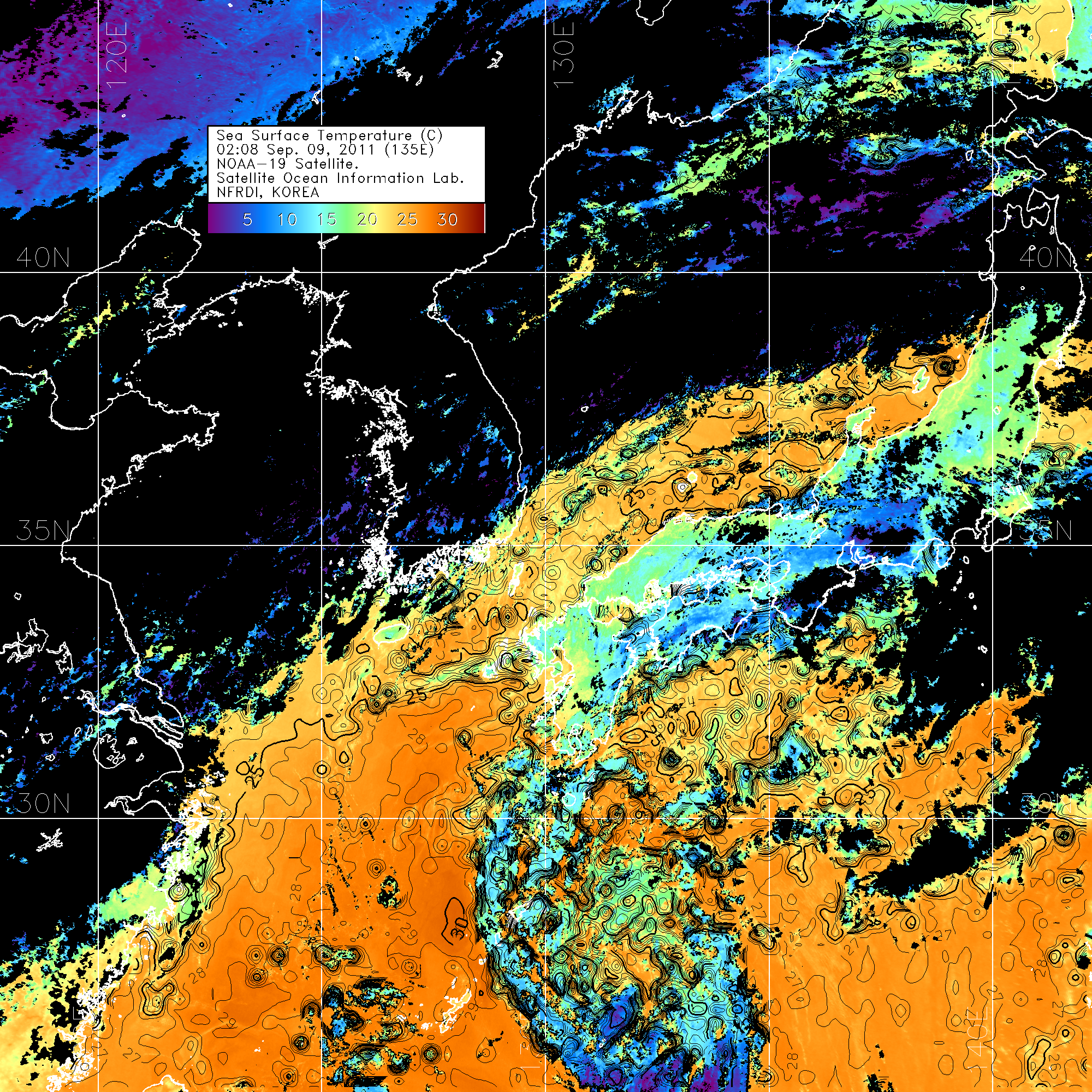 o 2011년 09월 09일 02시 08분 NOAA-19호 위성영상입니다. o 수온분포는 범례를 참고하시기 바랍니다. o 검은색은 구름을 나타냅니다. o 그림을 클릭하시면 크게 보실 수 있습니다.