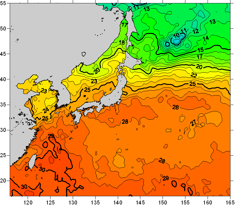 o 2011년 09월 10일 북서태평양 광역해양 수온분포 입니다. o 아래 위성 수온분포도는 국립수산과학원(NFRDI, Korea)과 일본동북대학교 (Tohoku University, Japan)가 공동연구개발 진행중, 1차 연구결과인 것으로 구름의 영향을 배제한 신기술의 수온정보입니다.