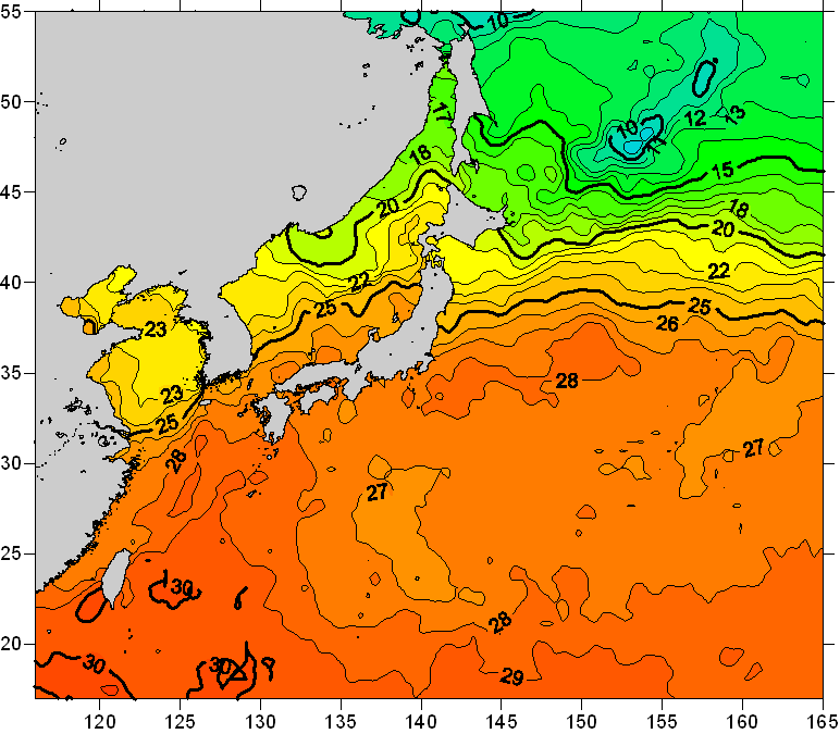 o 2011년 09월 12일 북서태평양 광역해양 수온분포 입니다. o 아래 위성 수온분포도는 국립수산과학원(NFRDI, Korea)과 일본동북대학교 (Tohoku University, Japan)가 공동연구개발 진행중, 1차 연구결과인 것으로 구름의 영향을 배제한 신기술의 수온정보입니다.