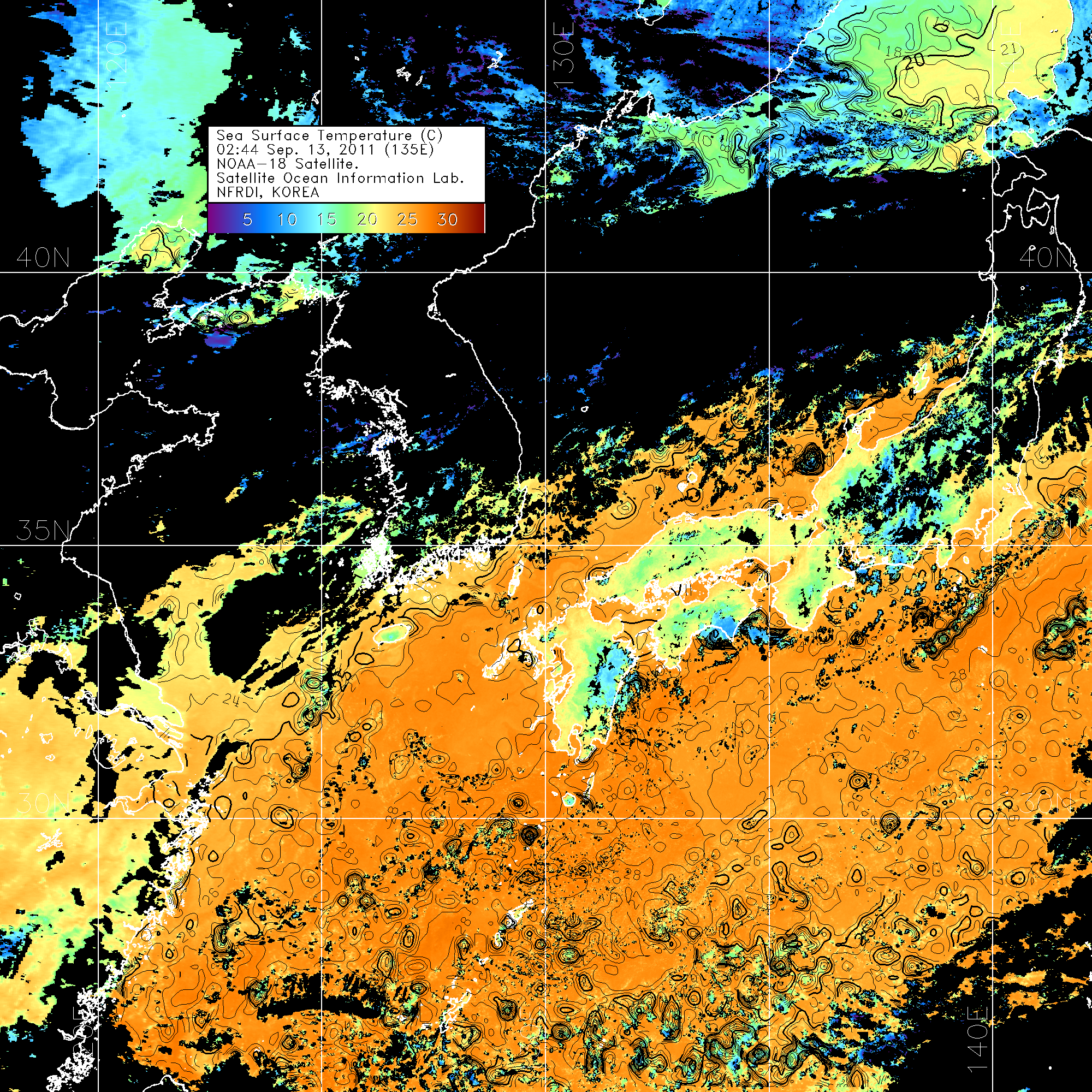 o 2011년 09월 13일 02시 44분 NOAA-18호 위성영상입니다. o 수온분포는 범례를 참고하시기 바랍니다. o 검은색은 구름을 나타냅니다. o 그림을 클릭하시면 크게 보실 수 있습니다.