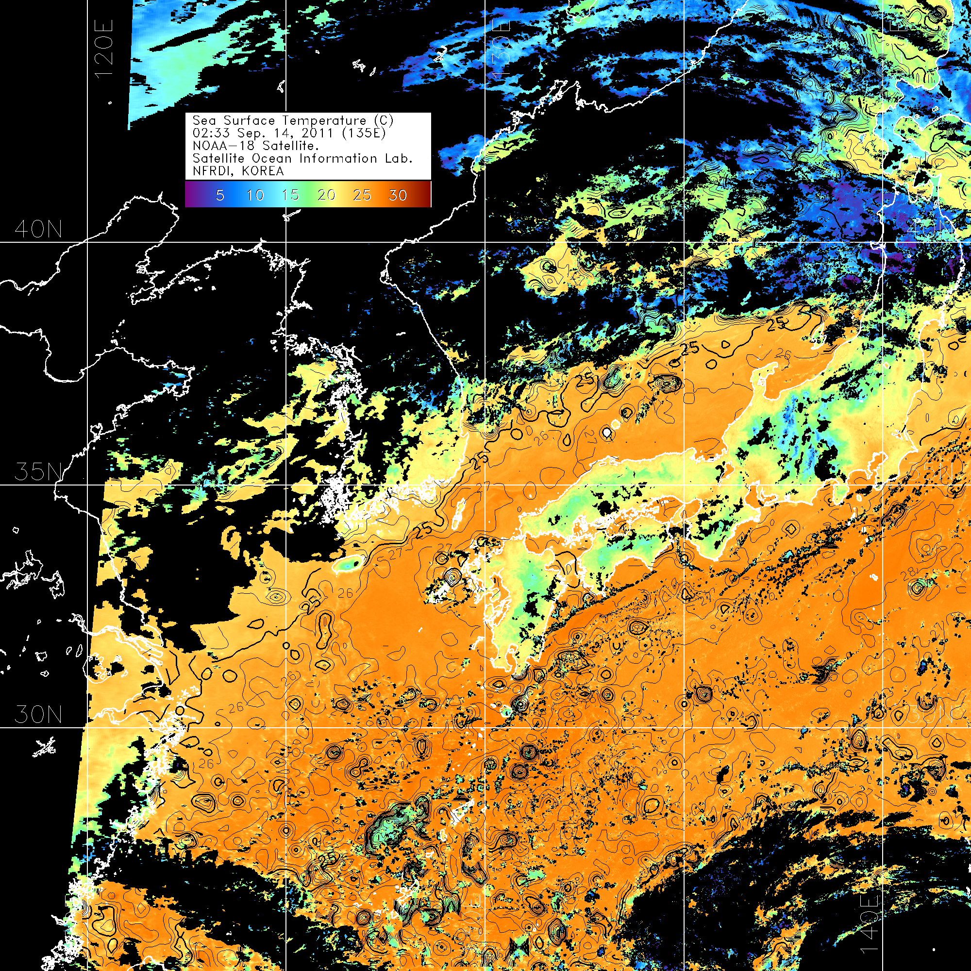 o 2011년 09월 14일 02시 33분 NOAA-18호 위성영상입니다. o 수온분포는 범례를 참고하시기 바랍니다. o 검은색은 구름을 나타냅니다. o 그림을 클릭하시면 크게 보실 수 있습니다.