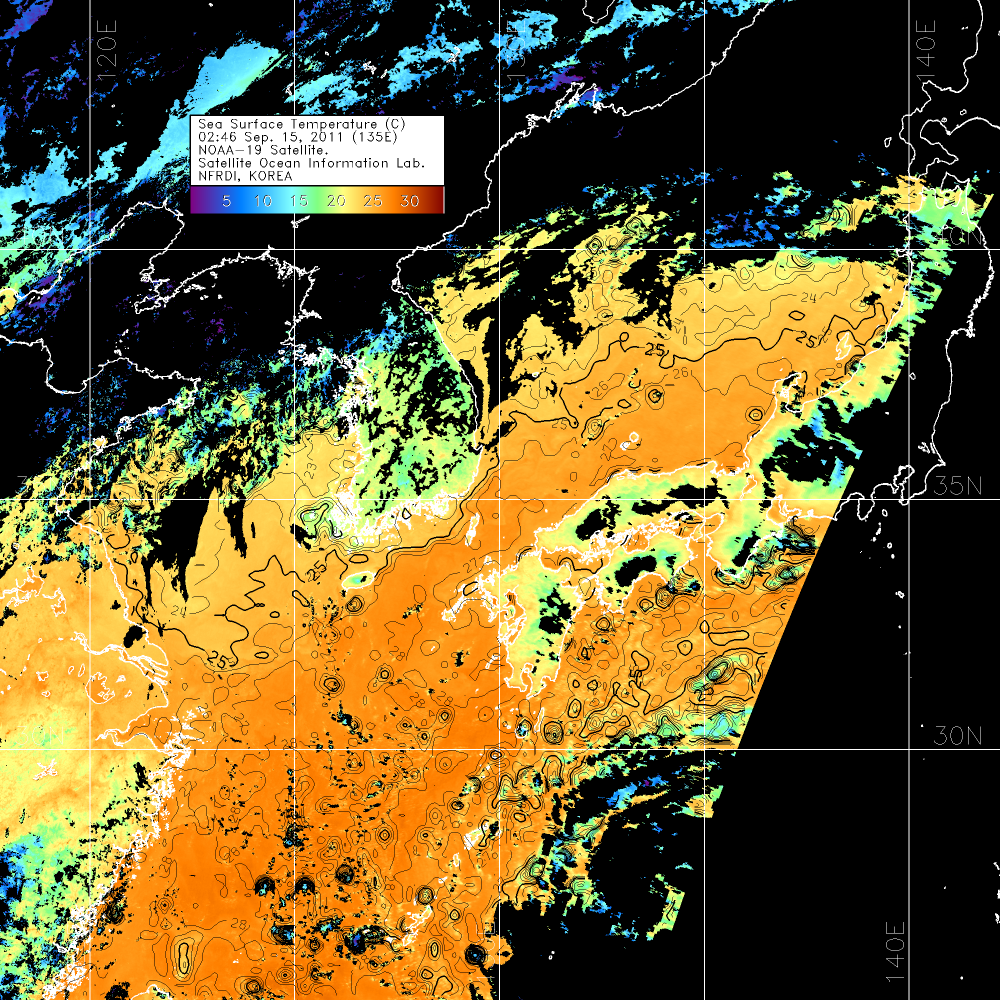 o 2011년 09월 15일 02시 46분 NOAA-19호 위성영상입니다. o 수온분포는 범례를 참고하시기 바랍니다. o 검은색은 구름을 나타냅니다. o 그림을 클릭하시면 크게 보실 수 있습니다.