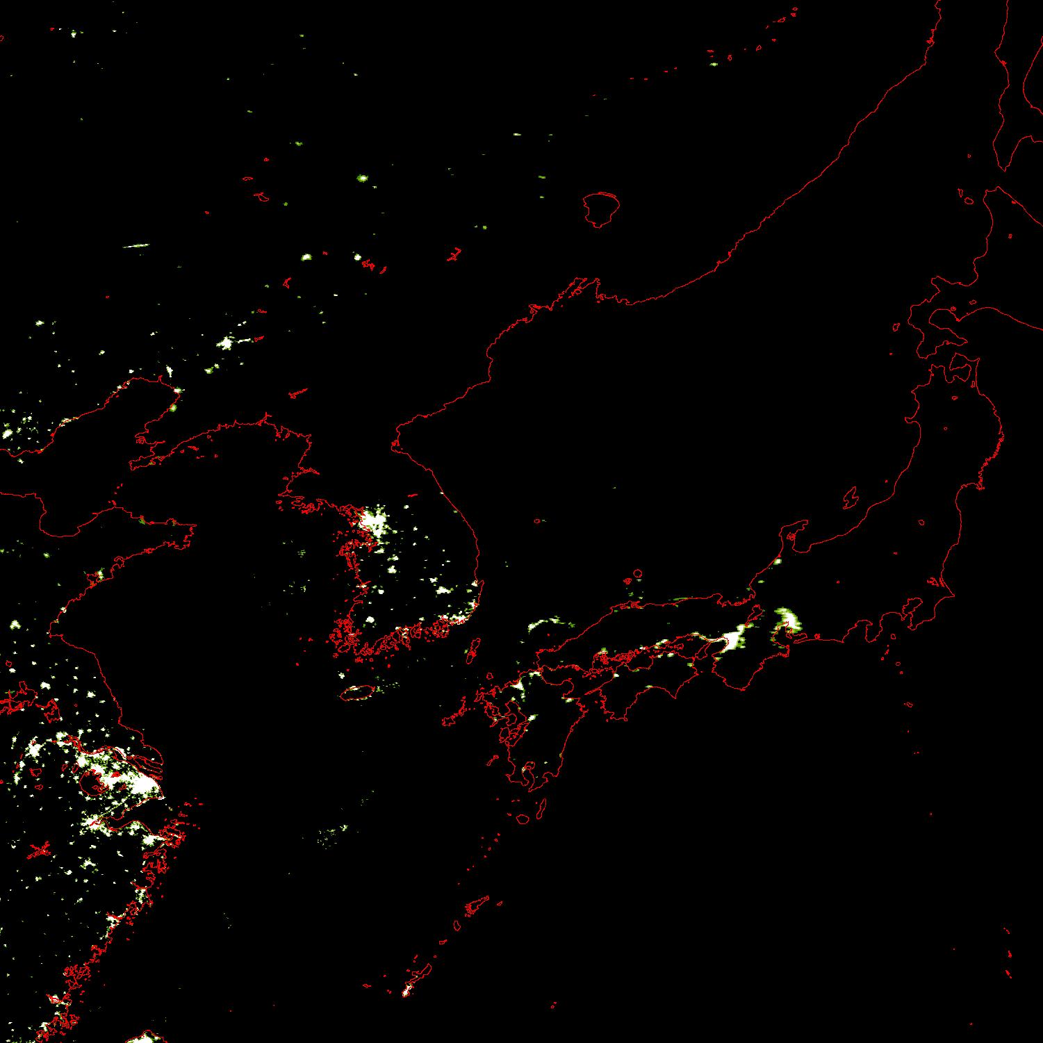 o 2011년 09월 14일 20시 39분 DMSP/OLS(Detense Meteorological Satellite Program/Operating Linescan System) 영상입니다. o DMSP/OLS는 야간 불빛을 탐지하는 위성으로, 야간 조업 어선 분포 현황을 알 수 있습니다. o 그림을 클릭하시면 크게 보실 수 있습니다.