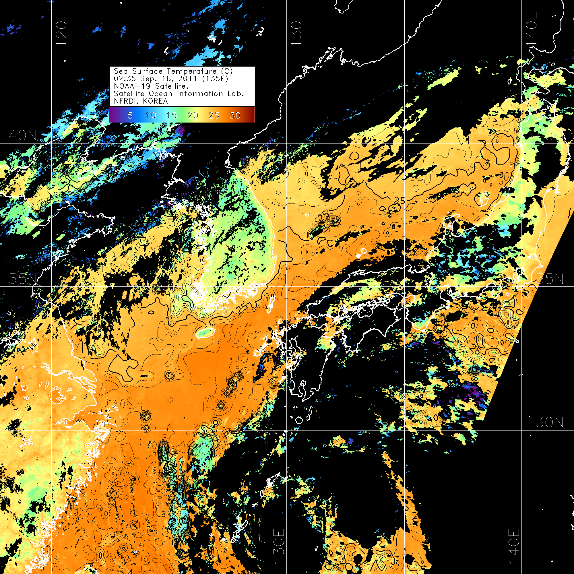 o 2011년 09월 16일 02시 35분 NOAA-19호 위성영상입니다. o 수온분포는 범례를 참고하시기 바랍니다. o 검은색은 구름을 나타냅니다. o 그림을 클릭하시면 크게 보실 수 있습니다.
