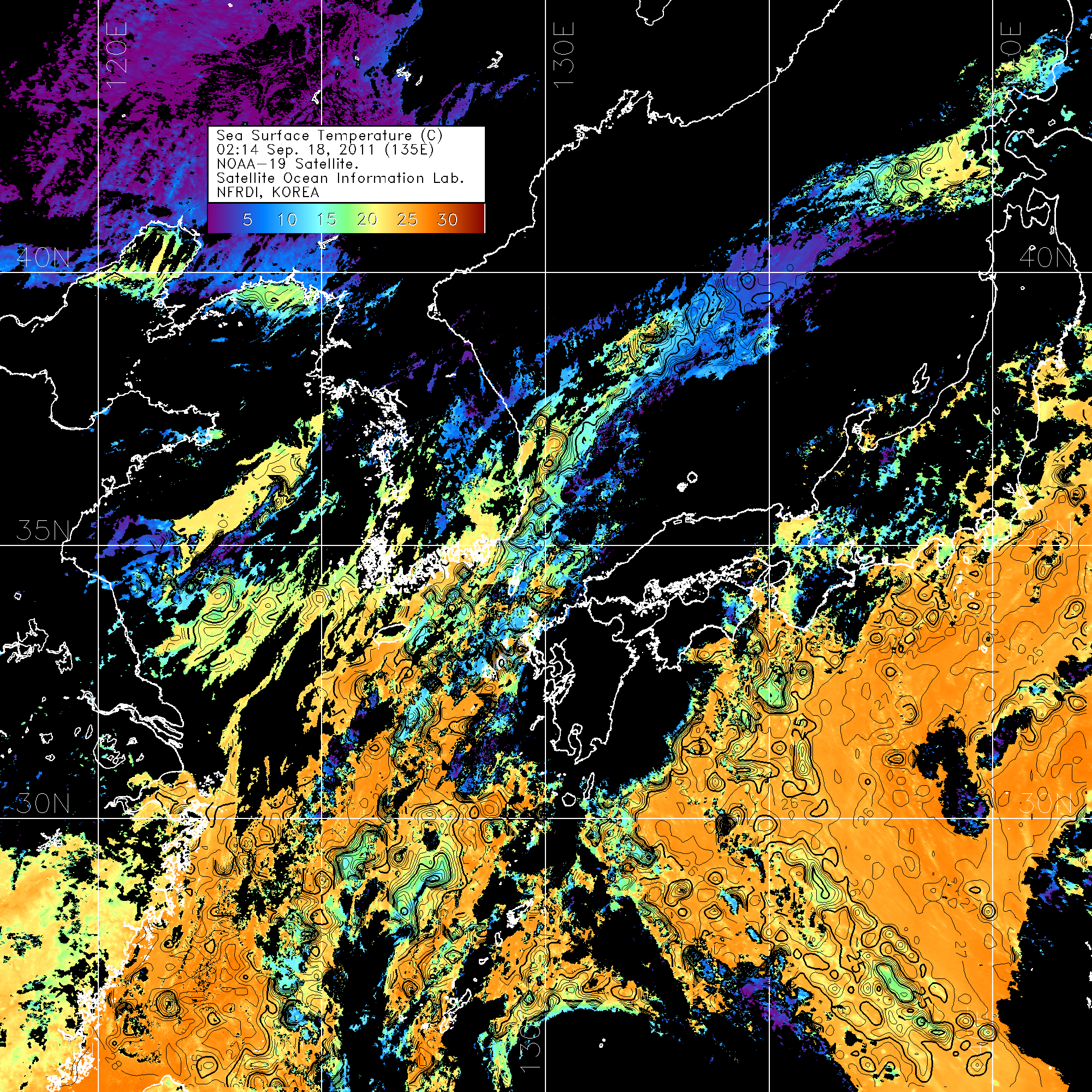 o 2011년 09월 18일 02시 14분 NOAA-19호 위성영상입니다. o 수온분포는 범례를 참고하시기 바랍니다. o 검은색은 구름을 나타냅니다. o 그림을 클릭하시면 크게 보실 수 있습니다.