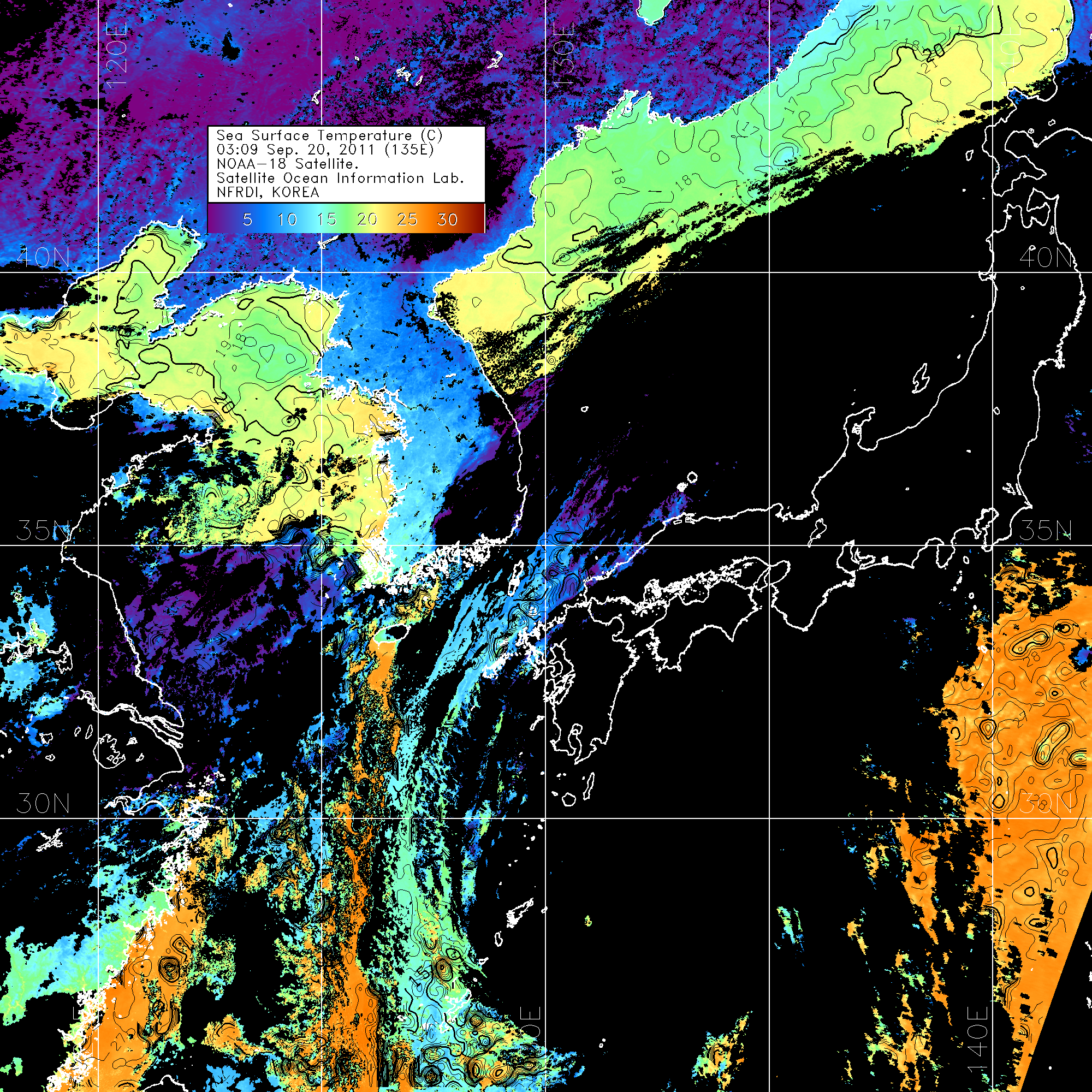 o 2011년 09월 20일 03시 09분 NOAA-18호 위성영상입니다. o 수온분포는 범례를 참고하시기 바랍니다. o 검은색은 구름을 나타냅니다. o 그림을 클릭하시면 크게 보실 수 있습니다.