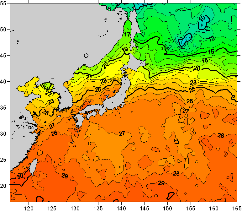 o 2011년 09월 19일 북서태평양 광역해양 수온분포 입니다. o 아래 위성 수온분포도는 국립수산과학원(NFRDI, Korea)과 일본동북대학교 (Tohoku University, Japan)가 공동연구개발 진행중, 1차 연구결과인 것으로 구름의 영향을 배제한 신기술의 수온정보입니다.