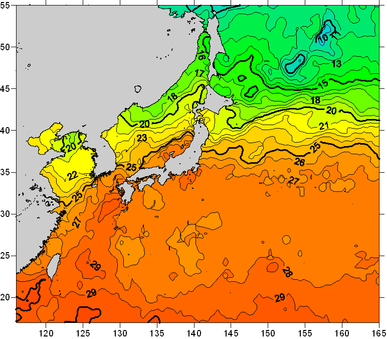 o 2011년 09월 20일 북서태평양 광역해양 수온분포 입니다. o 아래 위성 수온분포도는 국립수산과학원(NFRDI, Korea)과 일본동북대학교 (Tohoku University, Japan)가 공동연구개발 진행중, 1차 연구결과인 것으로 구름의 영향을 배제한 신기술의 수온정보입니다.