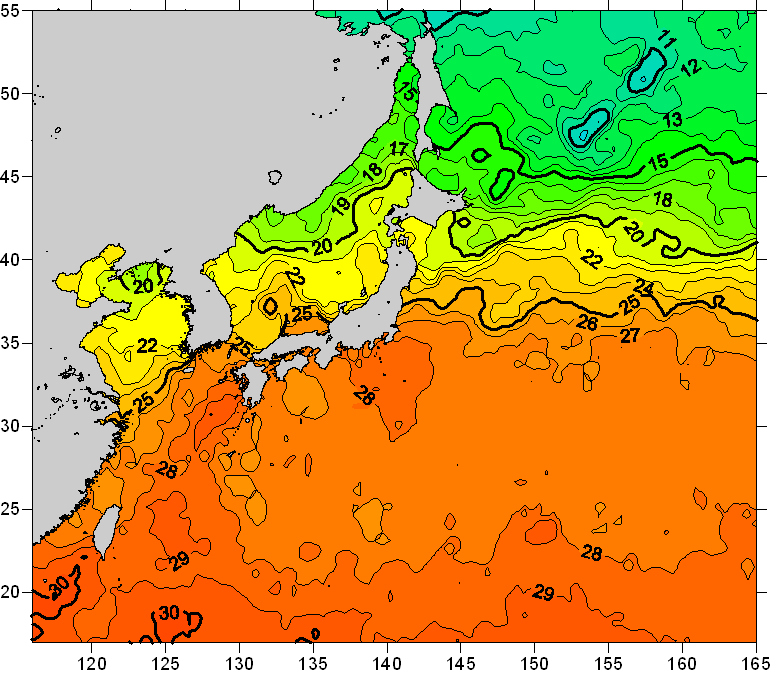 o 2011년 09월 21일 북서태평양 광역해양 수온분포 입니다. o 아래 위성 수온분포도는 국립수산과학원(NFRDI, Korea)과 일본동북대학교 (Tohoku University, Japan)가 공동연구개발 진행중, 1차 연구결과인 것으로 구름의 영향을 배제한 신기술의 수온정보입니다.